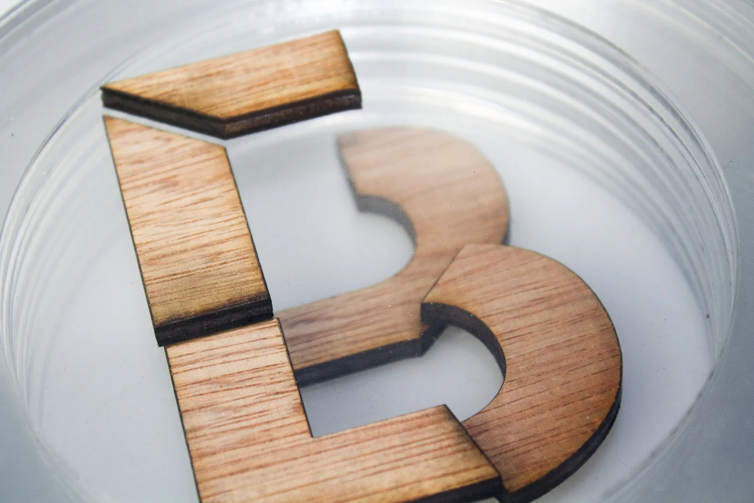I decided to use UIC's Fab Lab Laser Cutting machines to help create the perfect shapes and letterforms. To make this piece I started with acrylic sheets cut into 6 whole circles, and 5 hollow circles. Next, I would take a letterform and break it down into 5 pieces. Then I cut those pieces into wood shapes. Then, I would begin to layer. First one lays down a whole acrylic circle and then a hollow one on top. Then you place the wooden shape within and cover it with another whole acrylic circle. Continue process until all wooden pieces sit within acrylic circles.