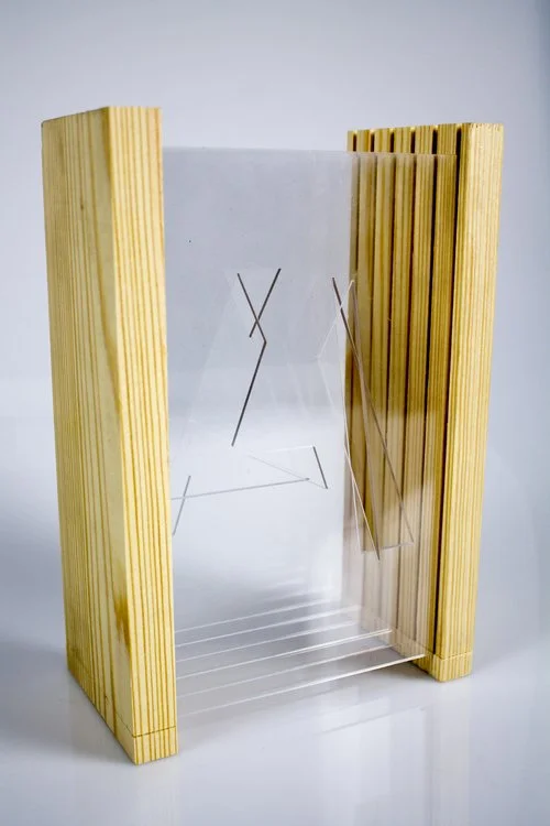 I knew that at least the external structure would need to be hard and retain it's shape so I chose acrylic both for it's strength and transparent quality. This material would also allow for the visual representation of "space." Next, I decided to chose wood for the internal space. It would hold it's shape as well but add another level of texture.